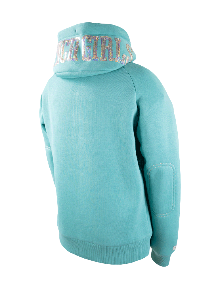 The Ranch Girls Hooded Sweat Jacket SHINY in mint will keep you warm, cozy, and looking stunning at the same time. The comfortable raglan sleeve design allows full freedom of movement, while the rounded hood sits neatly without bulk and features elegant sequin embroidery.